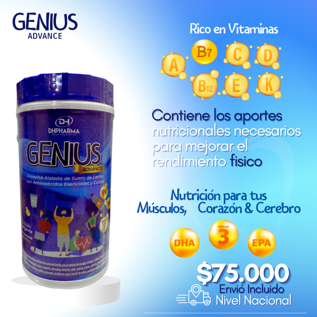 Genius Advance es un suplemento nutricional en polvo diseñado para potenciar cuerpo y mente, formulado con ingredientes funcionales y clínicamente respaldados. Su combinación inteligente de proteínas limpias, Omega 3, superalimentos y un complejo multivitamínico completo lo convierte en una opción ideal para: niños desde los 4 años, deportistas, adultos mayores y personas en recuperación o con requerimientos nutricionales elevados.
